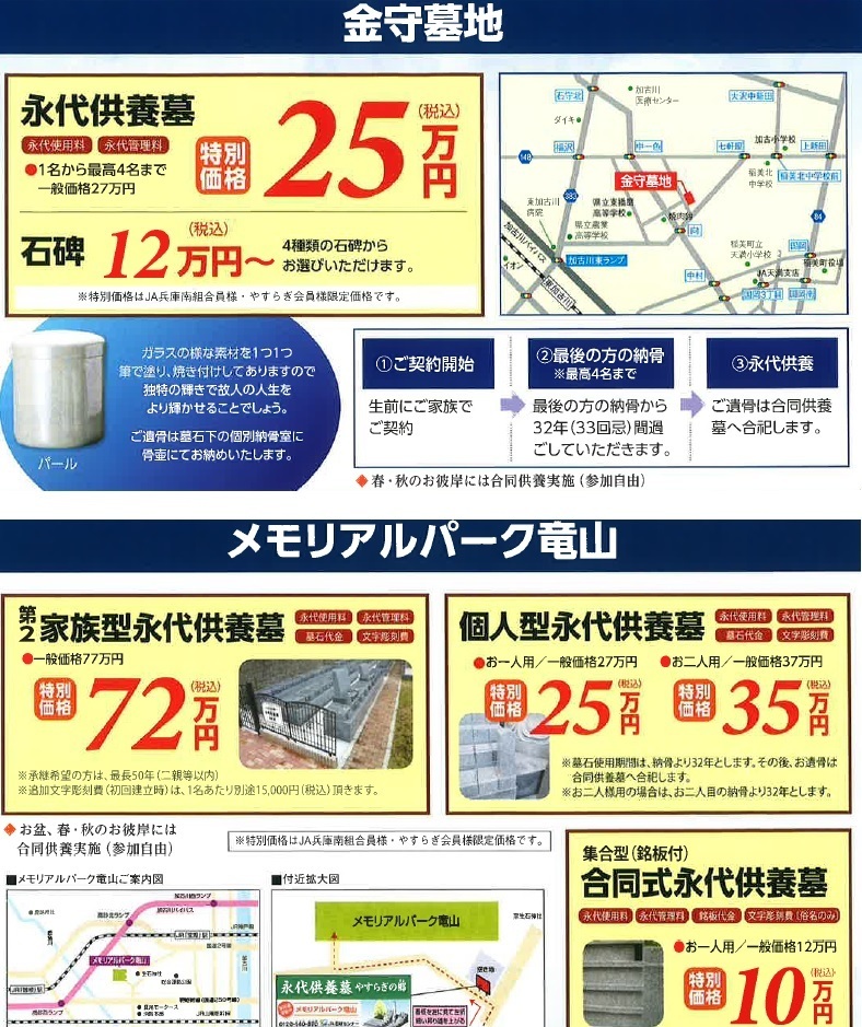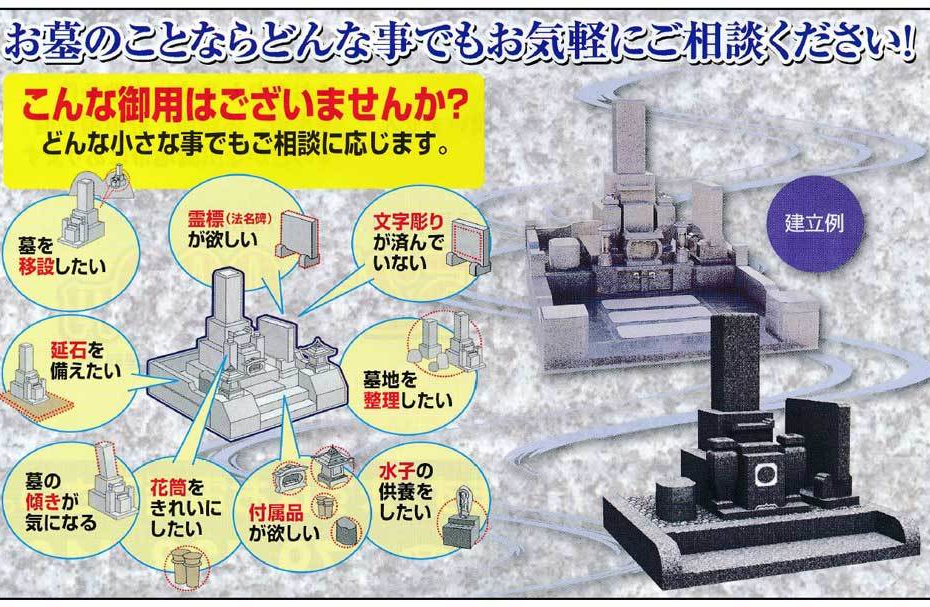 JA石材センターでは、安心と信頼をモットーに、図面設計・見積もりの無料提出、工程写真の提示、完成後のメンテナンスなど、高品質なサービスをご提供しております。また、建墓の時期、宗派に合った正しいお墓作りや祀り方のご指導・ご提案、お墓の移転整備・改修、神社・お寺の石工事、造園工事など、あらゆるご相談に専門スタッフがお応えします。